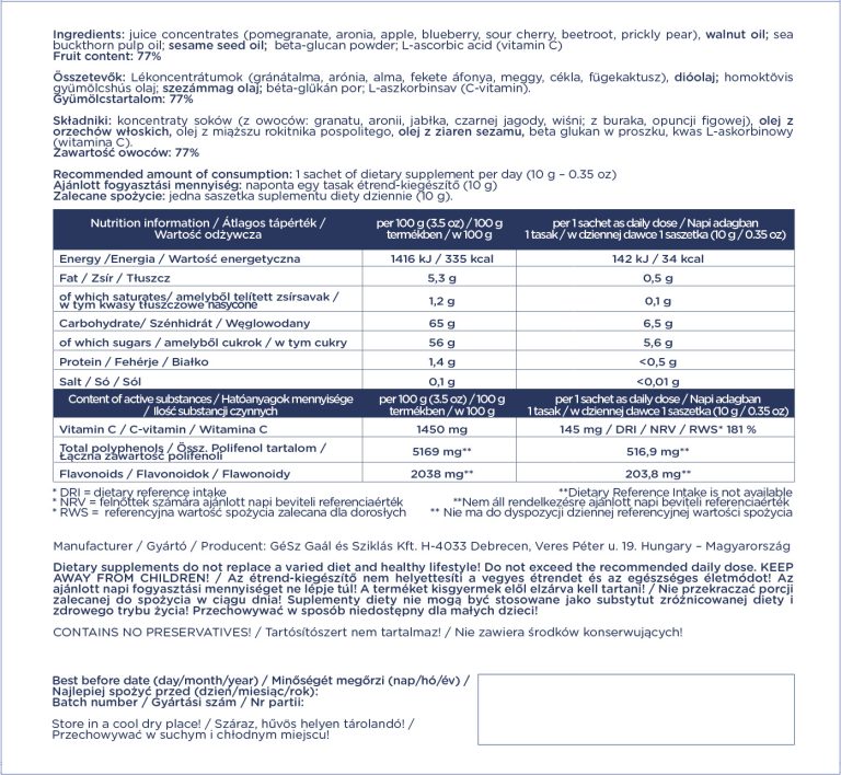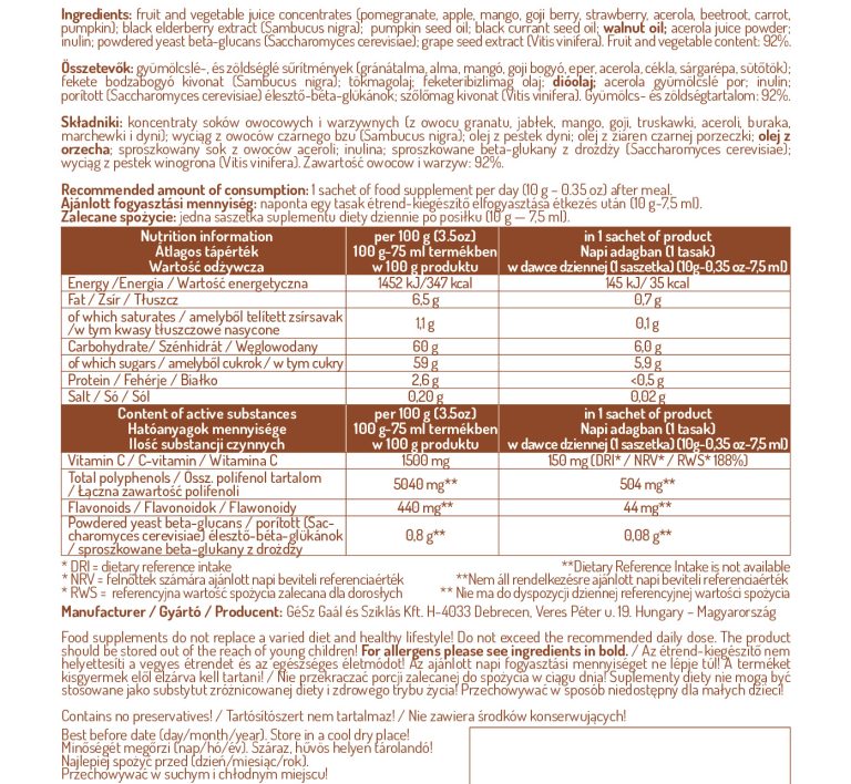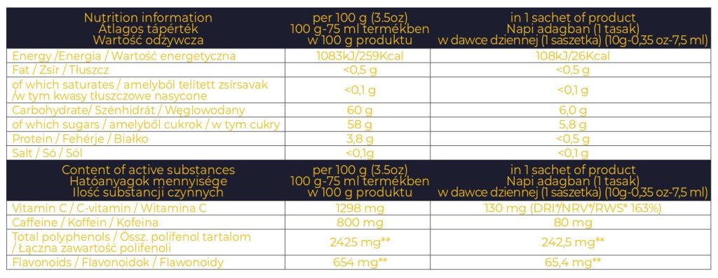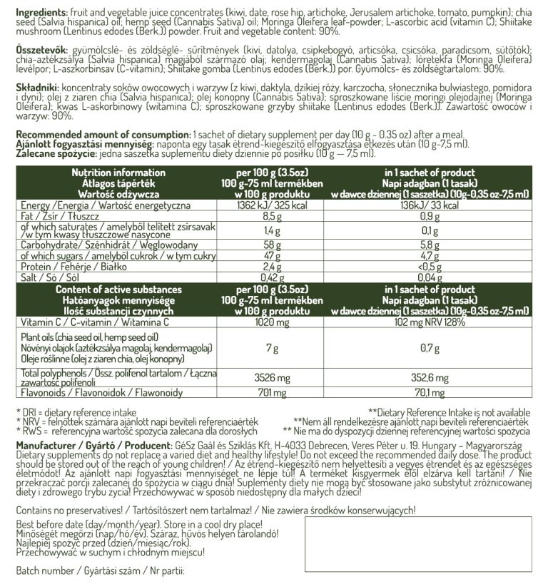 A termék jellemzője a magas, jó biohasznosulású C-vitamin-tartalom, sok benne az élelmi rost, a fehérje, a poliszacharid és a bioflavonoid, illetve a többféle antioxidáns hatású fitokemikália. A terméktől szinergetikus élettani hatások várhatóak, melyek hozzájárulhatnak a mentális és a fizikai állapot javulásához.